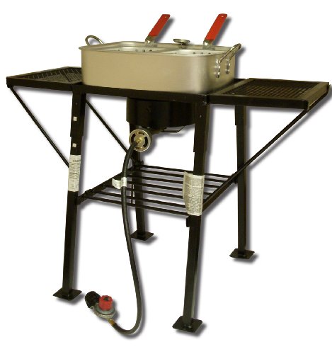 Heavy duty 25-Inch rectangular portable propane outdoor single burner camp stove with removable legs, 54,000 BTU cast burner, recessed top for extra safety, flame protective windguard, listed LP hose and regulator with type 1 connection, attachable heavy duty side and bottom shelves for workspace and storage, rectangular aluminum fry pan and 2 punched aluminum baskets with heat resistant handles, deep fry thermometer. Instruction/recipe booklet. CSA design certified.