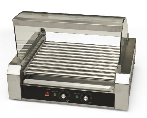 This machine holds up to 30 hotdogs at a time, allowing you to make more food in less time. Perfect for all sporting events and great for commercial uses such as convenient stores, liquid stores, long meetings, farmers markets' and many more. SPECIFICATIONS: CE approved; Maximum capacity: 30 hot dogs; All stainless steel; Glass hood for dust protections; All 11 stainless steel rollers rotate 360°; Heavy-duty motor and safety temperature control; Dual, front and Rear temperature controls; Temperature Control Range: 0-250 degree centigrade; Front batch for roasting, back for keeping warm; FREE removable and easy to clean stainless steel drip tray; 'Heat up' and 'keep warm' control modes; Skid proof rubber feet for tabletop use; Built-in fuse; Convenient, energy-saving and high efficiency; Grill dimension: 23" L x 16" W x 15-1/4" H; Tray size: 17-3/4" L x 16" W; Power: 2200 Watts; 110V/50Hz