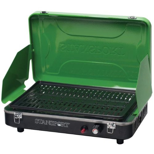 This Stansport deluxe stove is the latest and greatest in camping portable table top grills and stoves. It has a 12,000 B.T.U. tube burner with 180 square inches of cooking surface. It works great for hamburgers, hot dogs, steaks, or whatever you choose to cook on your next camping trip. This grill offers state of the art piezo electronic matchless ignition technology, so you won't need to worry about matches. This stove offers a non-stick coated cooking grate, so your food will not get stuck to the surface of the grill, which allows for easy cleanup afterwards. This product also offers a stainless steel drip pan and removable grease tray to make that cleanup process even easier. The thing that really separates this grill from other portable grills is the sturdy wind screens on the side which prevent your fire from going out. This item is sure to make a wonderful addition to your next camping or picnic cookout.