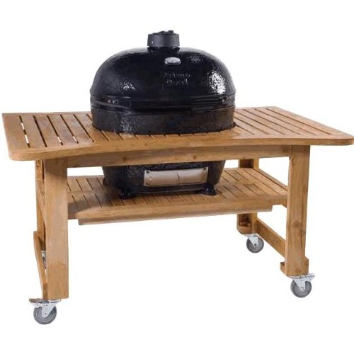 Primo Ceramic Charcoal Smoker Grill On Teak Table - Oval Junior. 774 + 610. Cart Mounted Charcoal Grills. Choose Primo and experience the best in kamado style charcoal cooking. The Primo Oval Junior Smoker Charcoal Grill is a medium to large size grill with all the benefits of the original, uniquely shaped Oval XL, but for those who do not need as much cooking area. The distinct shape of the Oval Junior allows you to cook using direct or indirect heat, expanding your grilling options unlike any other kamado-style grill. This grill features easy to clean and reversible porcelain-coated cooking grates, as well as one of the highest sitting lids on the market which is great for cooking whole chickens. This kamado style grill is made in the USA, unlike its competition, constructed with premium grade Primo SuperCeramics, and coated with a protective, lead-free, and scratch-resistant porcelain glaze. The patented Primo Oval Junior efficiently retains and evenly distributes heat across the 210 square inches of cooking surface, perfect for maintaining a consistent temperature. Smoke meat at temperatures as low as 180 degrees Fahrenheit, or turn up the heat to more than 500 degrees Fahrenheit for searing and grilling. Use the cast iron chimney cap, stainless steel lower vent door, and easy to read thermometer for monitoring and keeping a precise temperature. The easy lift-and-lock hinge system keeps the lid raised in place, and the soft-close felt gasket protects the ceramic while opening and closing the lid using the cool touch handle. The included ceramic feet safely elevate your grill away from the combustible surface of the table, which is constructed by hand from durable teak wood. The curved design of the teak table makes it easy for you to get in close to the grill. At 45 inches wide, the table provides plenty of workspace for prepping food and room to store ingredients and grilling tools, while tastefully showcasing your Primo grill. Four revolving and lockable caste