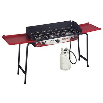 GB-90D Features: -Deluxe Folding Legs.-3-Sided windscreen protects flame from wind.-Folding shelves (fold into a protective lid and down into a spacious food preparation area).-Appliance-style temperature controls enable easy adjustment of output.-3 Cast aluminum burners provide lasting durability.-31'' Cooking height. Includes: -Optional Fry Burner Griddle stoves aren't included and must be purchased separately. Specifications: -Three 30,000 BTU/hours burners.-90,000 Total BTU / hours Tank sold separately. Dimensions: -Dimensions: 17.75'' H x 38.5'' W x 9.5'' D.