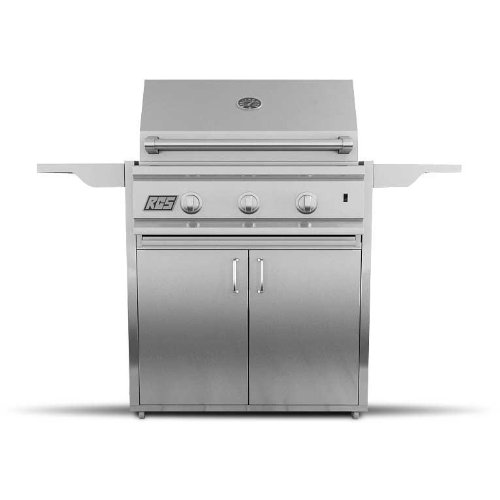 RCS Cutlass 27 Inch Propane Gas Grill On Cart. RON27A-LP+RONSC. Cart Mounted Gas Grills. The RCS Cutlass Series 27 inch propane gas grill on cart features two (2) stainless steel burners for 30,000 BTUs, plus a 15 inch stainless / ceramic rear rotisserie burner for 12,500 BTUs for a combined 42,500 BTUs of total cooking power. This grill is constructed of 304 stainless steel, making it the last grill you will ever need! This RCS grill also includes grilling zone separators that isolate specific cooking conditions to the specified grilling section. The stainless steel flame tamers prevent flare-ups for safer cooking, and heavy duty stainless steel cooking grids distribute even heat for ideal grilling conditions. Enjoy a reliable startup every time, with the Sure-Strike ignition system, and interior halogen lighting provides visibility for cooking in the evening. The heat indicator installed in the hood helps you monitor cooking temperatures during your grilling experience. With a 417 square inch primary cooking area, and a 160 square inch secondary cooking area, the RCS RON27A propane gas grill on cart gives you a total of 577 square inches of grilling space. Stainless Steel cart features fold-down side shelves, two doors, slide-out tank tray, all stainless steel housing and swivel casters. Cart must be fully assembled. Requires purchasing LP hose and regulator separately.