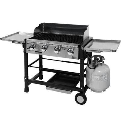 The 496 square inch primary cooking area is powered by four stainless steel burners totaling 48,000 BTUs of grilling power. With the portable tailgate unit, there's no more fumbling with the matches, just use the electronic ignition to fire up the main burners and heat up the porcelain-coated heavy-gauge wire cooking grates. The unit includes a stainless steel griddle accessory with a total of 245 square inches.